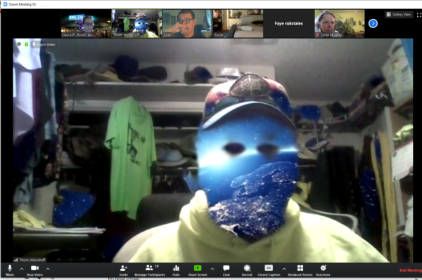 Thom the World Poet reads from his bedroom at the Lion and Pirate virtual open mic. Masking his face is a satellite image of Europe at night–made by Zoom’s background feature.