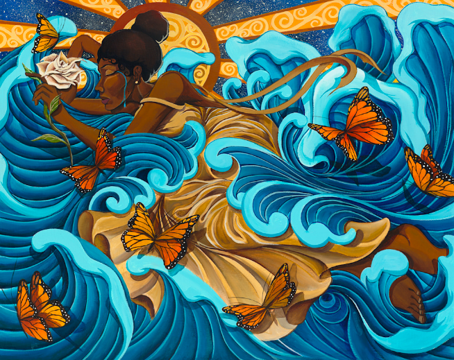 Jarrad now lives in Dallas, Texas with his wife and children. He makes art for the Neo-Soul or the progressive soul. One of my favorite things about talking to Jarrad is watching his brilliant mind in action. When I asked Jarrad about the medium that he works in, he answered in typical Jarrad fashion – by going beyond the answer of saying his medium is acrylic because he likes the vibrancy of colors.