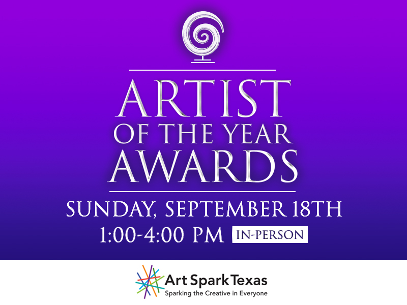 The 2022 Artist of the Year award winners will be honored at the annual awards ceremony hosted by Art Spark Texas at the Sterling Event Center at 6134 US 290 E. Frontage Road, Austin Texas, on Sunday, September 18, 2022. The event will be held from 1:00 to 4:00 PM CDT, and is free to attend. This will be an in-person live event. RSVPs are requested. All ages are welcome.