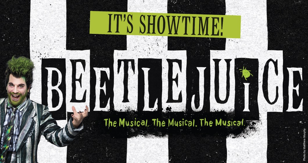 Image Description: Beetlejuice, dressed in a shabby black and white striped suit and with wild green-dyed hair and green stubble, makes a claw with his hand and laughs exuberantly. Off-kilter text appears against a black and white striped background, “It’s Showtime! Beetlejuice, The Musical. The Musical. The Musical.”
