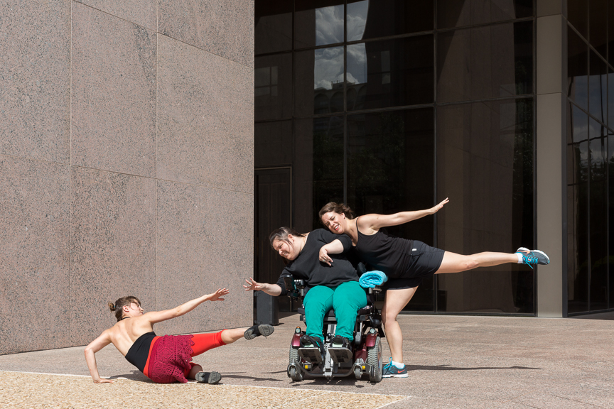 three dancers including one in a wheelchair perform in front of the Bob Bullock Museum