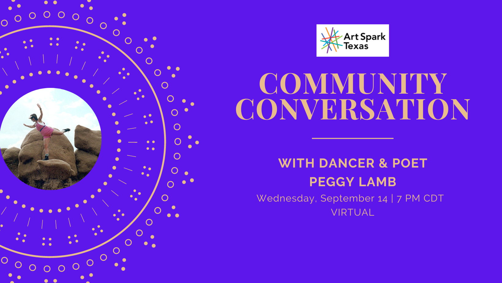 Join us Wednesday, September 14th, (7:00 PM CDT) for a virtual Community Conversation and meet Peggy Lamb, dancer, poet, and massage therapist. This Fall, she will be teaching a class with Art Spark Texas – Poetry of Movement with Peggy Lamb / Moving Through Writing for Women 50 and over. Find out more about this engaging class during Peggy’s conversation with Director of Dance Silva Laukkanen. Peggy will lead attendees in some activities similar to what she will be doing in the class.