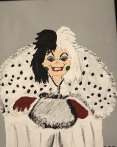 Come by and see her paintings of Mickey, Cruella De Vil, and more.