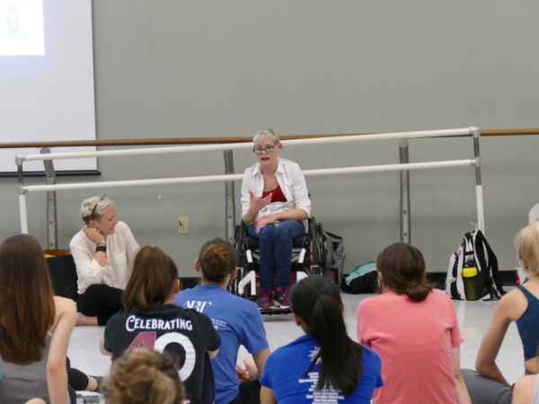 Tanya in front of students telling the story of how she ended up in the dance world. Silva is sitting on the floor laughing.