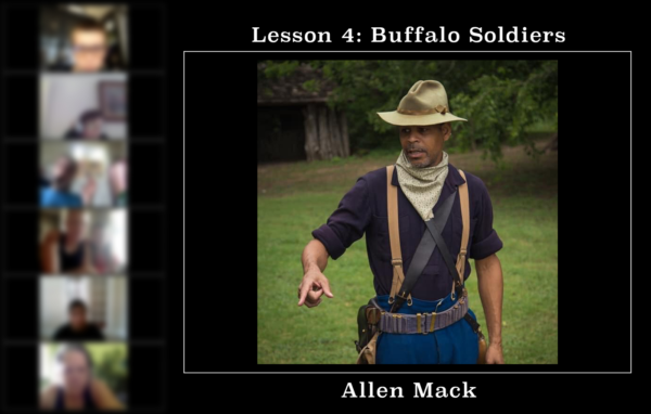 Each class in the 8 part series had several highlights but perhaps Lesson 4, The Buffalo Soldiers story, stands out for a number of reasons. Our special guest Private Allen Mack of the Living History Foundation dressed in full period specific uniform and performed an engaging account of what life was like for young African-American soldiers of the 9 and 10th infantry. His passion for the topic incited a wonderful discussion and seemed to excite students to share their bandanna art projects throughout the rest of class.
