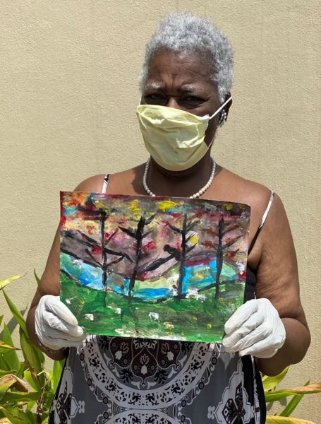 Theresa Zelazny, the Mobile Art Program Director, and Jessica Edberg, Mobile Art Instructor, met Bessie outside of her apartment complex on Sunday, August 23rd, 2020, to chat and take photos of Bessie and her watercolor project inspired by “Four Trees” by artist Egon Schiele. We are amazed by Bessie’s talent. She captured the four seasons in vibrant colors and added a little bird to one of the branches. Bessie said that we need all of the season for growth, the trees are in various stages just like we are: shedding old leaves and preparing to sprout new ones.