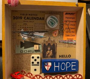Assemblage 1 – A shallow box filled with overlapping found objects such as page from a dictionary, scrabble letter, domino, images of planes, and words such as Hope, Hello, and Groruck.