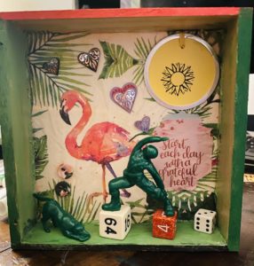 Assemblage 2 – A shallow box filled with overlapping found objects such as die, small green army man and dog in yoga poses, a paper napkin with a flamingo on it, a stamped tag, hearts, and a quote.