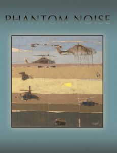 A soldier standing in the desert. Text reads, "Here, Bullet. By Brian Turner."         solderies standing in the desert. text reads, "My life as a foreign country."         Abstract painting of helicopters flying over the desert. Text reads, "Phantom Noise."