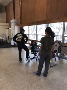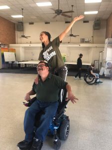 one dancer in a wheelchair with a stand-up dancer exchanging ideas of how to translate specific moves to different bodies. After rehearsals, all the dancers left with smiles on their faces and were excited to dance at Don’t Dis the Vote Flash Mob. At the end of the day, I asked myself the question, “What do I picture when I think of a dancer?” I did not refer to the tall, thin, white female dancer in a tutu. My vision changed to the principal dancers. I thought about how we all came from different backgrounds in dance, and how I learned to relax when dancing with people with disabilities. Gathering to express ourselves through the art of dance has been one of the best experiences in my dance career. I am fortunate to have gained some knowledge of disability culture during this experience.