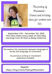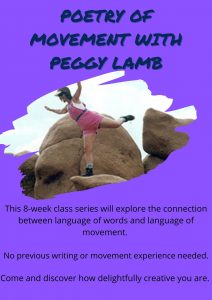 Peggy has always loved the intersection of dance and words, but after seeing a performance in New York City choreographed by David Gordon, which combined these two art forms in brilliant ways , her interest grew exponentially bigger. After seeing that performance she took a creative writing class. When I interviewed Peggy for this blog she said, “I love to explore that. What does the body say? Because the body speaks, but not in words, right? Then what is the cellular wisdom swimming through our bodies that needs to be expressed? And then how can we take that experience and express it in words?”
