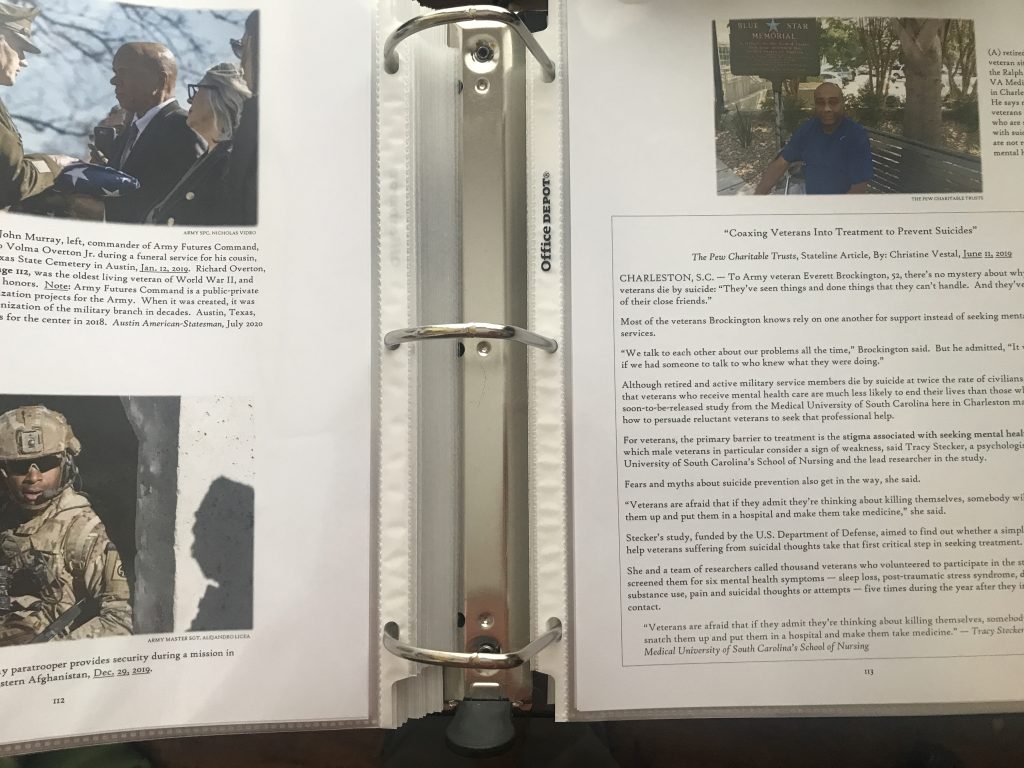 Speaking of resources for the Veteran community, we have a binder in our office that is at least three inches thick called “Homecoming – Air, Land and Sea: A Resource Book-Montage About Veteran Suicide and Prevention Strategies” compiled by Ronald Townsend, US Army Veteran, South Korea-Vietnam. This thoughtful, well-organized book is a compilation of images, articles, and press releases on the topic of Veteran suicide.