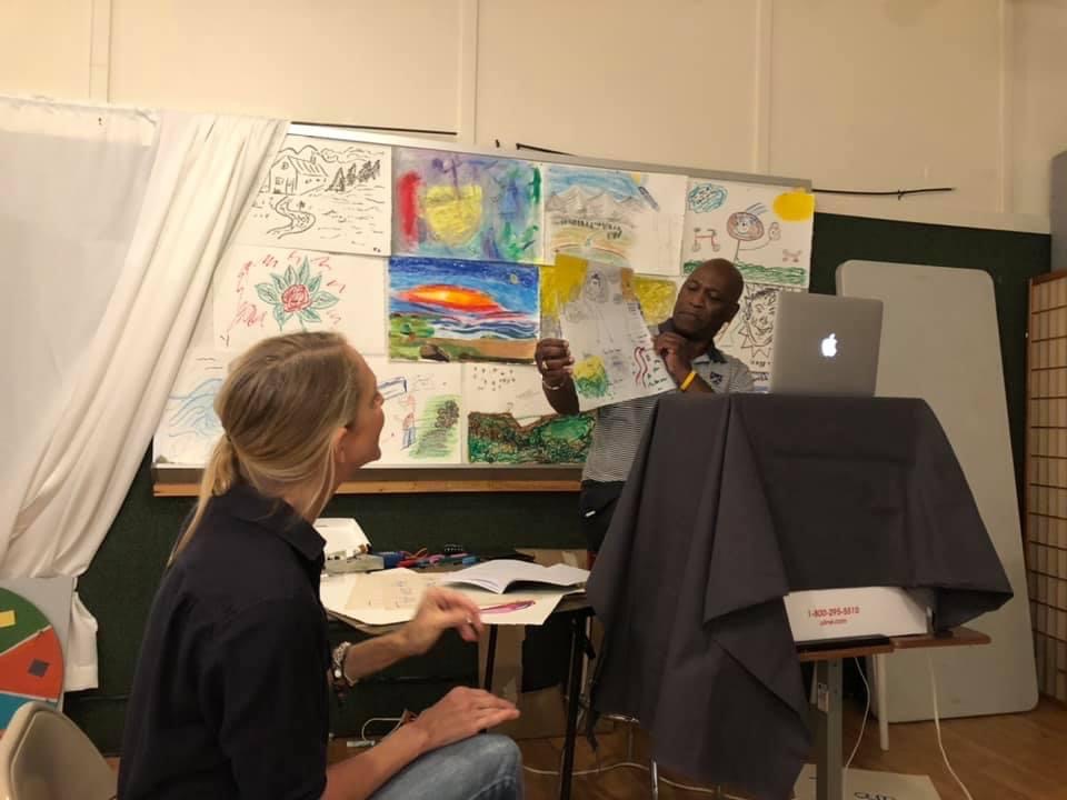 A photograph of Ronald sharing a visual art piece for his class. A teacher sits nearby while watching his presentation. Various other art pieces are posted on the wall behind Ronald.