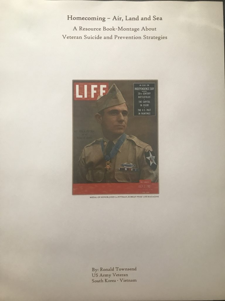A photo shows the title cover of a binder. Simple  black text at the top reads, “Homecoming - Air, Land and Sea: A Resource Book-Montage About Veteran Suicide and Prevention Strategies.” The cover of a 1950s LIFE Magazine shows a decorated Korean War Vet posing proudly. Text beneath the magazine cover reads, “By: Ronald Townsend, US Army Veteran, South Korea -  Vietnam.”