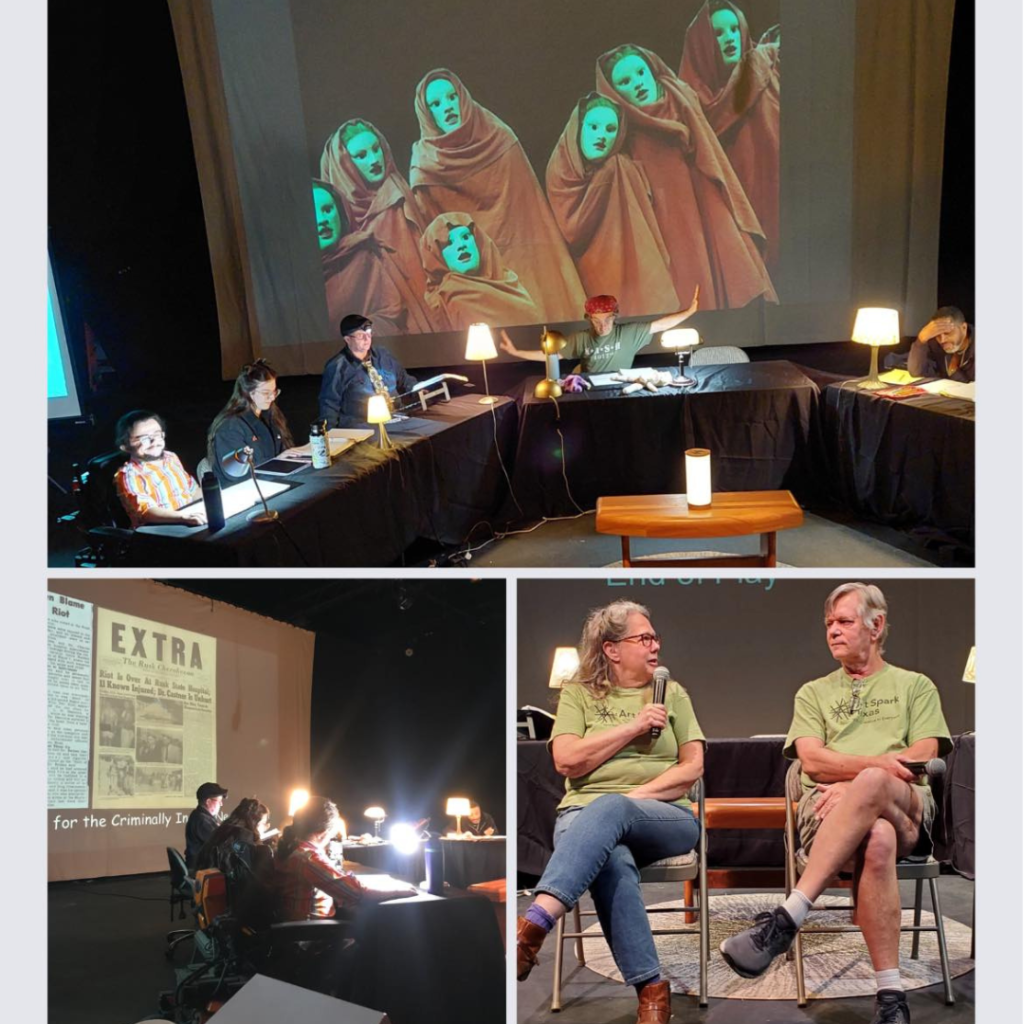 ID: Three images from the staged reading. Center top: Kurt and MsBoye with cast sitting at tables with black tablecloths during the performance. Backdrop is a classic image of Greek Chorus. Bottom left: Celia Hughes and James Burnside wearing green Art Spark T-shirts talk during post-show Q&A. Bottom right: Cast sits at tables during the performance view taken from the side of the stage.