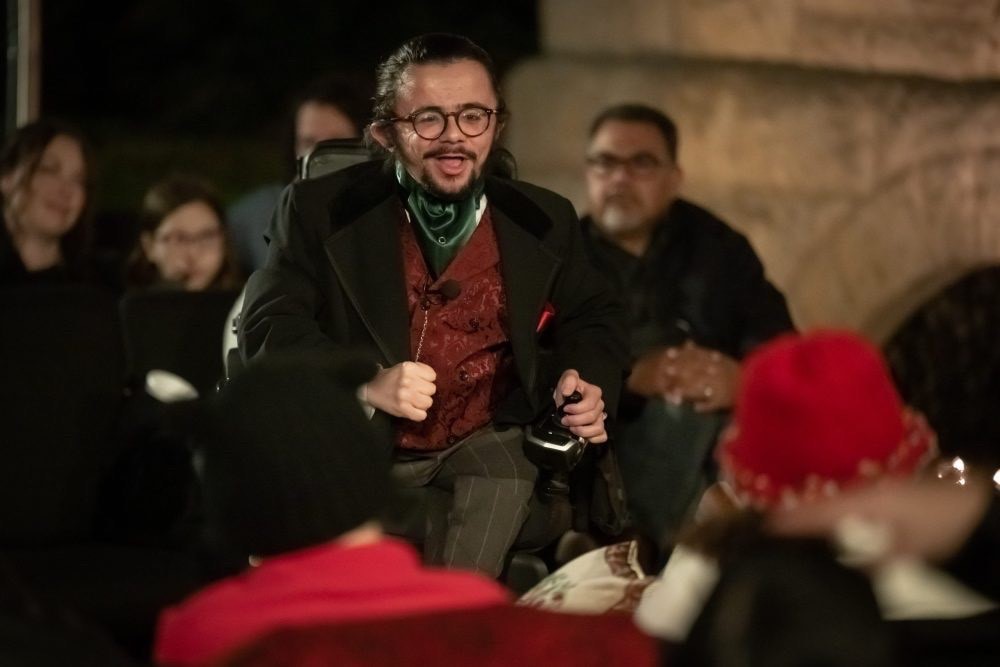 ID: Kurt on stage during a performance, sitting in an electric wheelchair. His left hand holds the control stick. Dressed in period dress, bearded with slicked-back black hair, with round black retro glasses. The audience can be seen in the foreground and background representing theatre in the round.