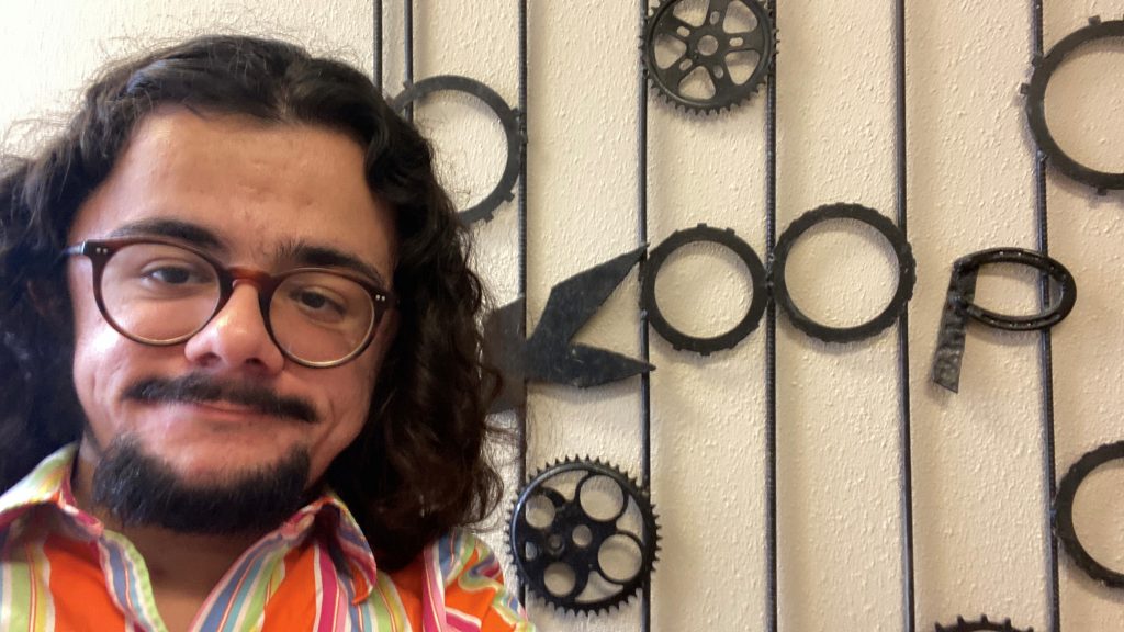 ID: Kurt sitting in electric wheelchair grins directly into camera. Wearing a bright multi-colored, striped button-up shirt and black pants. Shoulder length wavy black hair, with center parting and retro round glasses.