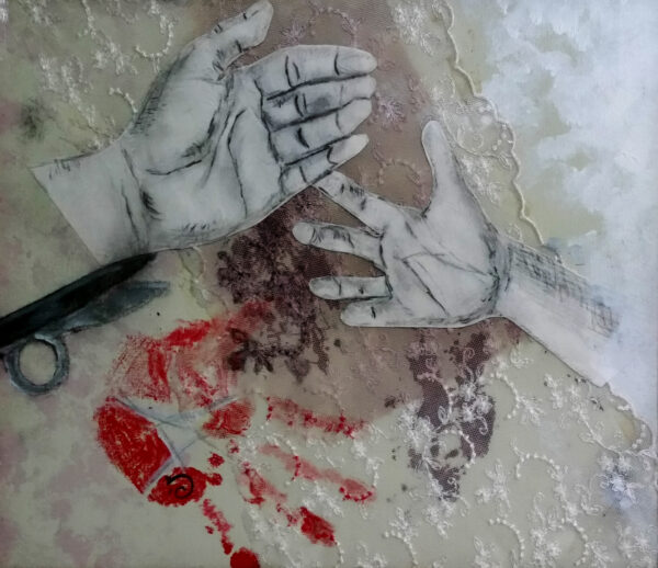 Lila’s work can also take a more diaristic and directly personal approach. In her piece “Reaching for Help” (above), two delicately-drawn hands are depicted in charcoal as they gesture towards one another. The tones of the background are subtle and come from the combination of ornate fabrics collaged to the surface. Color in this piece is reserved for a bright burst of red, a handprint that seems half-present. This collage, like her Hamilton Pool painting, is evocative of many emotions. A piece like this speaks to the other side of why Lila makes art, the healing side. I think this can best be summarized in her own words: