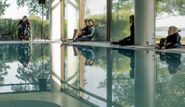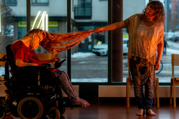 On the left, Gee in a wheelchair leans forward with their long, flowing hair streaming out in front of them. On the right, Sally, standing, gently holds the end of Gee’s hair, creating a visual connection between the two. The scene is bathed in warm, natural light, which enhances the intimate and serene atmosphere. The background shows a large window with an urban landscape outside, featuring buildings and parked cars. The overall composition highlights themes of connection, support, and tenderness. Photo credit: Jan Ahlstedt