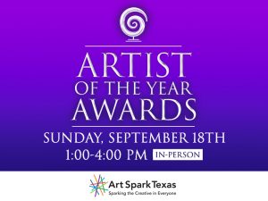 The 2022 Artist of the Year award winners will be honored at the annual awards ceremony hosted by Art Spark Texas at the Sterling Event Center at 6134 US 290 E. Frontage Road, Austin Texas, on Sunday, September 18, 2022. The event will be held from 1:00 to 4:00 PM CDT, and is free to attend. This will be an in-person live event. RSVPs are requested. All ages are welcome.
