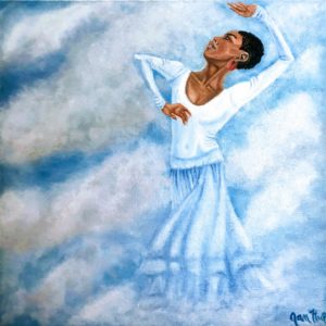 painting of woman dancing in the clouds