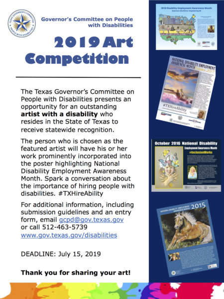 The posters will feature original work from an outstanding Texas artist, along with their picture and personal statement, and the national NDEAM theme. The winning artist will also be featured at GCPD’s annual Lex Frieden Employment Awards Ceremony, and may be acknowledged in a statewide press release. Help spark a conversation!