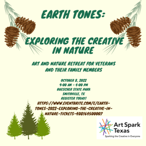 Earth Tones 2022: Exploring the Creative in Nature is presented by Art Spark Texas. It is a free art and nature retreat for Veterans and current and prior military and their family members. Read more about the activities and workshop instructors here!