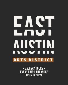 Stylized graphic reads, “‘East Austin Arts District, Gallery tours every third Thursday from 6-9 pm."