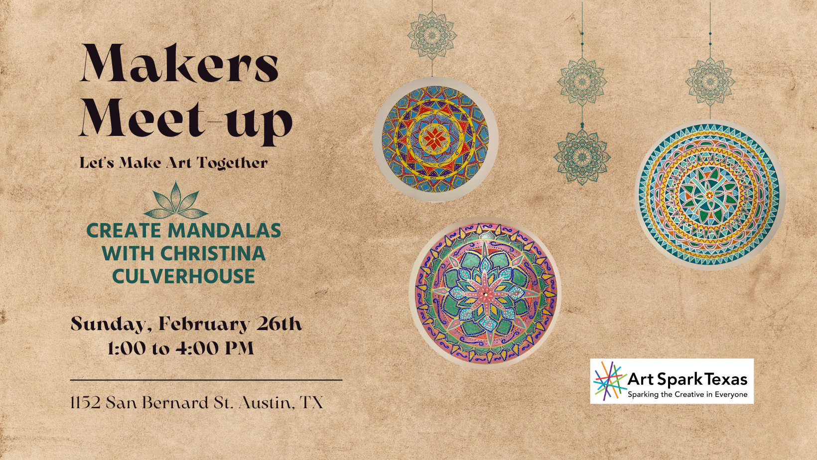 Join us at our monthly Makers Meet-Up Sunday, February 26 from 1-4:00 PM! Open to all artists of all abilities, teens to adults – the Austin community is always welcome! Create a beautiful mandala in a friendly and supportive workshop. Artist Christina Culverhouse will teach us how to make colorful and mesmerizing mandalas like the ones pictured on our event cover page. It’s free to participate. We will have the supplies needed plus yummy snacks! Questions? Contact [email protected].