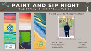 Join us for a Paint and Sip event on Thursday, June 30th in the evening! Teaching Artist Judith Estrada Garcia will help you paint your fantasy vacation using acrylics. All levels, including beginners, are welcome and are guaranteed a great time. All supplies, wine and snacks will be provided. Register now to secure your spot.