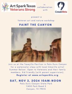 Join Art Spark Texas and CreatiVets in this fun two-hour painting workshop down in the Palo Duro Canyon on Saturday, November 2, 2024 from 10 am – noon.