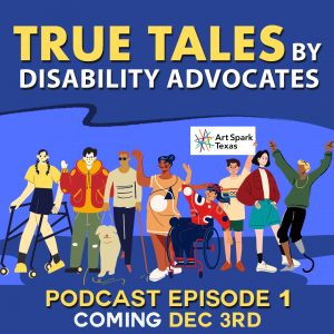 Join us as we celebrate the launch of True Tales by Disability Advocates, a podcast created by Art Spark Texas’ Speaking Advocates group. On Friday, December 3rd, we will be hosting a virtual ‘Meet the Team Launch Party’ at 1 PM featuring a panel of our speaking advocates discussing the project, how it’s unique, and their vision. The meeting opens at 12:45 PM.