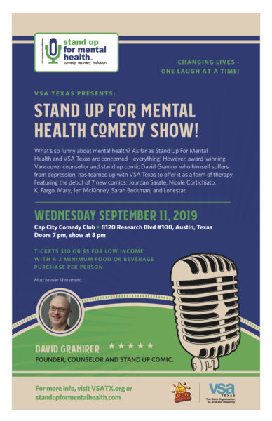 Most people think you have to be nuts to do stand-up comedy. However, Vancouver-based, award-winning counselor and stand-up comic David Granirer has teamed up with Art Spark Texas to offer it as a form of therapy. Granirer, who himself has depression, is the founder of Stand Up For Mental Health, a program teaching stand-up comedy to people with mental illness as a way of building confidence and fighting public stigma.