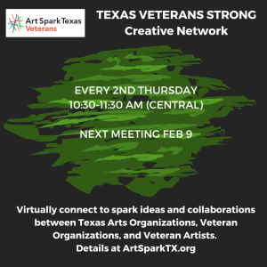 Join us for this monthly virtual creative network that connects Arts Organization, Veteran Organizations, and Creative Veterans to share ideas, network, and collaborate to elevate and support or creative Texas Veterans. Together, we are strong!