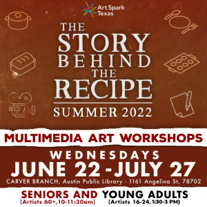 Here in Austin, we love food! And this summer, Art Spark Texas needs your help to share the story behind your home recipes! During June and July we are offering Austin Seniors and Young Adults a series of multimedia art workshops that focus on building connection through food. We will learn the tools of visual art and video to share these recipes and stories. The focus of the videos will be “The Story Behind the Recipe”. Seniors will participate in a 4 week series of writing, illustration, and video interview activities. Classes for Seniors will take place 10-11:30 AM on Wednesdays. Young Adults will participate in a 6 week series of new media training workshops on audio/video recording, animation, and editing. Classes for young adults will take place 1:30-3 PM on Wednesdays. Each workshop covers a new tool and thus creates a new piece of content for our final videos. Our goal is to use the power of art to share Austin culture and bring together two diverse groups of people around the central focus of food. Artists of all experience levels welcome!