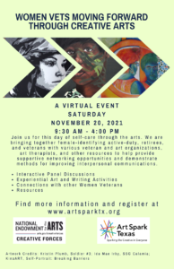 Join us for this virtual event, a day of self-care through the arts. We are bringing together female-identifying active-duty military, retirees, and veterans with various veteran and art organizations, art therapists, and other resources to help provide supportive networking opportunities and demonstrate methods for improving interpersonal communications. The day will include Interactive Panel Discussions, Experiential Art and Writing Activities, and Connections with other Women Veterans Resources.