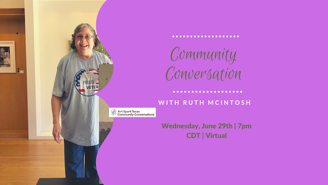 Join us virtually on Wednesday, June 29th, (7:00 PM CDT) when our Artist of the Month, Ruth McIntosh, a multimedia visual artist, writer, dancer, and Air Force Veteran,